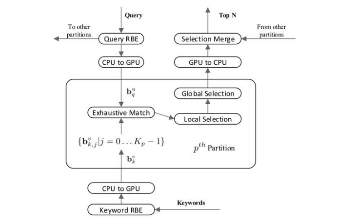 用于关键词检索的系统架构如图 4 所示。该系统被称为基于 GPU 的 RBE 信息检索系统,或 rbeGIR 系统。首先,该系统采用了多个 GPU 来存储和处理 RBE 嵌入。圆角矩形内展示了第 p 个 GPU 的组成部分。在图 4 底部我们可以看到,关键词首先被离线转换为 RBE 向量,然后从 CPU 存储单元(寄存器、cache 等)转移到 GPU 显存中。另一方面,查询会被即时转换为 RBE 向量。GPU 内的穷举匹配组件,则负责计算查询的 RBE 嵌入与每个关键词之间的相似度。为了找到最佳关键词,匹配结果将指导第 p 个 GPU 负责局部选择和全局选择过程。所有 GPU 的计算结果都将通过选择合并(Selection Merge)对生成的 top N 关键词作出贡献。