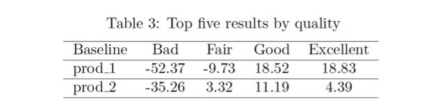 如表 3 所示,在 2000 个查询中,每个查询返回的前 5 个关键词的平均质量为「差」、「一般」、「良」或「优」。表 3 中的每一列代表对应于每列标签的查询-关键词对数量的百分比差距。例如「良」的结果,rbeGIR 系统分别比 prod_1 和 prod_2 高出了 18.52% 和 11.19%。