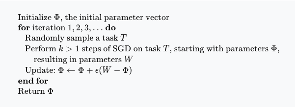 与MAML类似,Reptile寻求神经网络参数的初始化,以便神经网络能够利用少量数据进行微调。但是当MAML通过梯度下降算法的计算图展开并求导时,Reptile只是以标准方式对每个任务执行随机梯度下降——它不展开计算图,也不计算任何二阶导数。这使得Reptile比MAML占用更少的计算和内存。伪代码如下: