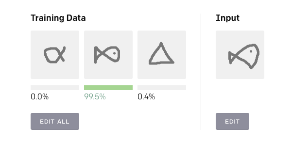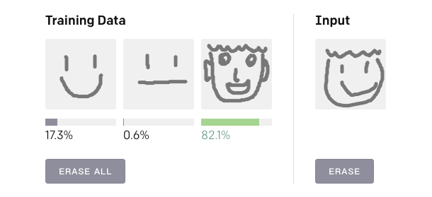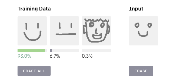 下面就是该算法的一个Demo,在Training Data中画三个训练图像,然后在Input区域画一个输入图像,算法会自动判断这个输入图像属于训练图像的哪一类,并用概率表示。