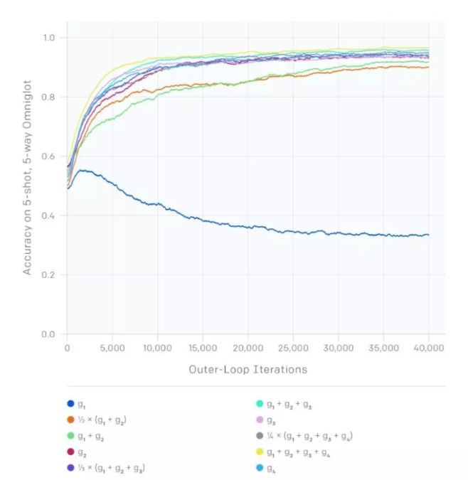 我们对Reptile的分析表明我们可以将随机梯度下降以不同方式结合,获得很多不同的算法。在下方的表格中,假设我们在每个任务中执行了k步随机梯度下降,生成了梯度g1,g2,…,gk。下面的图表显示出Omniglot上的学习曲线,它是将每个和看作元梯度获得的。g2对应的是MAML原始论文中提到的一阶MAML。由于方差缩减,梯度包含的越多就会生成越快的学习速率。需要注意的是,只使用g1(即对应k=1)在这一任务中是无法产生进步的,因为零次学习的性能无法改进。