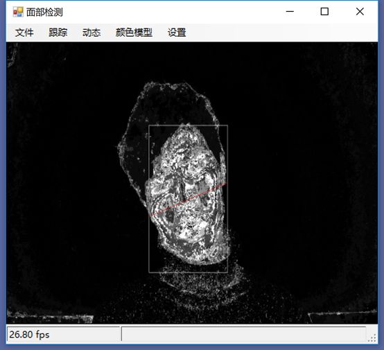 物体面部特征正在被追踪。我们在物体周围看到的是面部追踪器(白色线框),它告诉我们我们这里有一张脸;以及我们的角度探测器(红线),它提供了一些关于我们脸所处水平方向的参考。