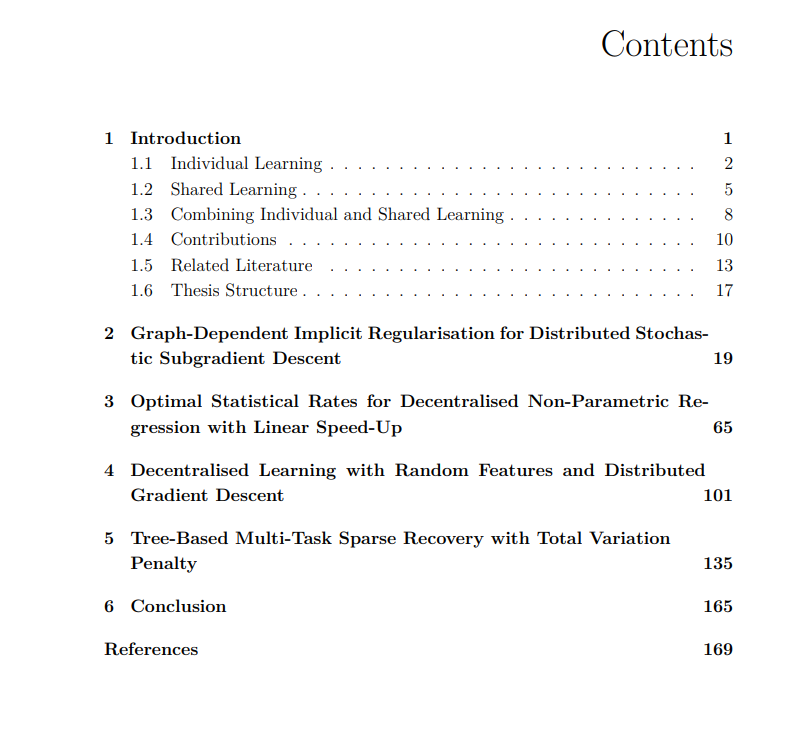 本文研究了在这种分散框架下产生的模型的统计性能。通过将计算机网络建模为图中的代理,我们研究了两种不同的统计设置:同质性,即存储在计算机之间的数据遵循相同的分布;异质性,当分布不同时。在齐次环境下,受经验风险最小化问题的激励,我们考虑了一个简单分散算法的学习性能:分布式梯度下降。具体地说,我们证明了在非参数回归的情况下,可以通过隐式正则化和计算运行时的线性加速来保证学习性能,前提是计算机有足够的数据量。相比之下,之前的工作主要是通过更通用的共识优化框架来关注优化性能,这并没有对幕后更精细的统计结构进行编码。更准确地说,我们演示了这种结构可以用于以下两方面:允许通过算法参数隐式地控制模型复杂性; 并且由于统计集中的现象,代理所持有的信息可以是相似的。在非均相情况下,考虑了由高光谱解混引起的设置。具体来说,我们考虑同时恢复稀疏信号(与代理相关)的集合,这些稀疏信号以反映网络拓扑的方式相关。简而言之,底层分布中的差异是通过反映网络的总变异惩罚来编码的。当信号充分相关时,该方法比group lasso风格的方法节省了样本复杂度。