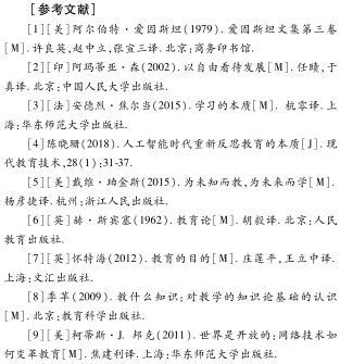 在传统课堂上,教师处于中心地位,代表着知识的权威和课堂的最高智力水平,他也是班级智慧的源泉。但所教的主要是书本上的碎片化知识,教与学强调的是对知识的记忆和复述,传道受业解惑的最终目的是帮助学生学会做题,考出高分。在知识网络化后,教室里最聪明的绝对不是站在讲台前上课的老师,而是所有人加起来的智慧(朱永新,2017)。网络时代的知识教学,教室内的智力水平将取决于师生群体、网络以及人工智能等新技术智能的叠加。在未来社会,信息传输方式将多元化,以文字为载体的传输方式将衍生更多元的信息传输方式,电视、网络、手机、微信、语音、视频等不断消融教师的中心地位。视频、图像、声音、虚拟现实等将信息以生动形象、贴近现实的形式传递给学生,更有助于学生的理解与体验(张治等,2017)。网络、人工智能、虚拟现实等新技术不仅丰富了课堂教学方式和教学组织形式,为提高教学质量创造了条件,使教学内容有了新的传播方式,还使视觉、听觉、感觉全方位参与其中的体验式学习成为可能。例如,虚拟现实的沉浸感、交互性、想象性有助于激发学习动机,增强学习体验,实现情境学习,促进知识迁移(张治等,2017)。在充满未知和不确定性的网络时代,新技术与教学的深度融合提升了认知效率,技术让信息呈现富媒化,学生构建概念的过程将从感官而不是解读文字结构概念开始。对事物的认识需要在沉浸式环境中多感官参与,混合现实会让学习和认知效率极大提升,甚至产生更高效的学习方式。现在,我们已进入借助智能设备生存与发展的时代,人机结合的学习方式会发挥更大作用,认知外包现象会让个人更加注重方法论的学习(张治等,2017)。基于创造的学习、基于项目的学习、创客学习等新型学习将逐渐成为网络时代学习者的主流学习方式。单向灌输知识的时代将终结,教师的工作将发生根本转变,传道授业解惑的工作将转变为创造性活动的组织者、引导者和陪伴者。培养获取新知识的能力、知识整合能力、问题解决能力、知识迁移能力和探索未知世界的能力,成为网络时代知识教学的应有之义。