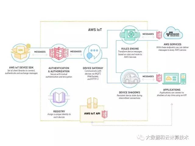 AWS IoT 提供有 SDK,使用提供的SDK集成到IOT设备和移动应用程序中,设备和程序就不用关心数据是怎么发送以及发送到哪里去。AWS支持MQTT、HTTP 或 WebSockets 协议连接和验证 AWS IoT 并与之交换消息。MQTT比较有意思,1999年IBM发明的,核心是开销小,支持使用发布/订阅消息模式,提供一对多的消息发布,解除应用程序耦合,非常适合IOT场景。