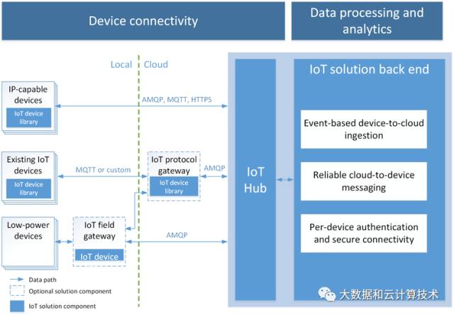 设备可以直接与云网关终结点通信;如果设备无法使用任何云网关支持的协议,则可以通过中间网关进行连接。例如,AzureIoT 协议网关可以在设备不能使用 IoT 中心支持的任何协议时执行协议转换。