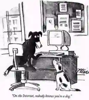 1993年7月5日,著名杂志《纽约客》刊登了一则由Peter Steiner创作的漫画,漫画中有两只狗,一只坐在计算机前的一张椅子上,与坐在地板上的另一只狗正在对话,说的正是那句闻名全球的俚语On the Internet, nobody knows you're a dog(在互联网上,没人知道你是一条狗)。