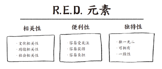 所谓R.E.D.,即相关性R(relevance)、便利性E(ease) 和独特性D(distinctiveness)。