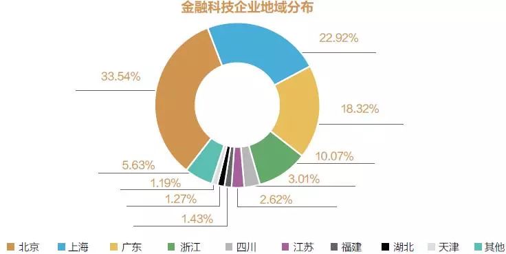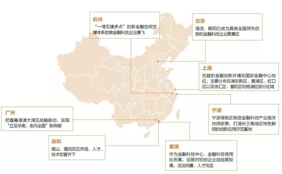金融科技企业以其金融属性及科技属性, 主要集中在北京、上海、深圳、杭州、广州、宁波等城市,以上各市纷纷依托产业园区建设、出台扶持政策,促进金融科技产业聚集和发展。
