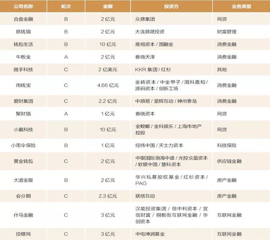 2017到2018年5月, 投融资过亿的金融科技公司达到32家, 融资轮次覆盖A轮到E轮, 其中B轮和C轮最多, 各有 11家; A轮紧随其后, 达到8家; D轮和E轮各一家。 融资额度在10亿人民币以上的有两家, 点融网和随手科技。 融资企业业务大多集中在互联网金融、消费金融和第三方支付, 商业模式以B2C居多。
