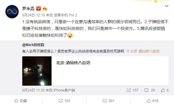 但让子弹短信成为主流,恐怕也不是罗永浩或者快如科技的目的。在回应市场“挑战微信”的说法时,老罗是这样说的: