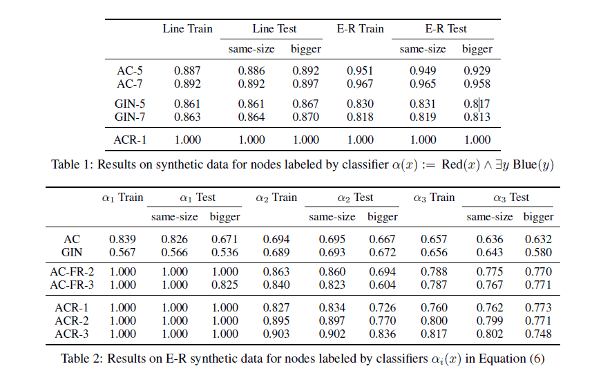 为展现理论上证明的 ACR-GNNs 的表现力和 AC-GNNs 与 ACR-GNNs 的区别,作者选择在合成数据集上进行实验,具体如下:一个展现 ACR-GNNs 可以学习到而 AC-GNNs 不能学习到的一个简单的 FOC2 节点分类器的实验和一个涉及到更加复杂的 FOC2 分类器去学习更多直接相关的 readout 函数的实验。