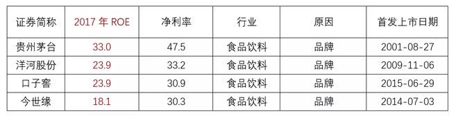 第二种是品牌。品牌带来高净利率,我国消费品上市公司里,凭借品牌获取高净利率的很少,毕竟中国人习惯西方人的奢侈品。但是我们有白酒,有四家白酒公司凭借着高净利率进入了高ROE榜单,分别为贵州茅台、洋河股份、口子窖和今世缘,净利率分别为47.5%、33.2%、30.9%和30.3%,真的是你们有奢侈品,我们有白酒。