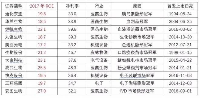 第三种就是技术或者研发优势。你有的别人没有,那么在行业里你自然可以获得高净利率。在选出的32种企业里这种占比最高,而且基本是某个细分领域的冠军。比如胰岛素市场的通化东宝、血制品市场的华兰生物、血液灌流器市场的健帆生物等等,其他的如色选机、口蹄疫疫苗、缝纫机电控、粉尘螨滴剂、电子装联、电子陶瓷和IVD等等市场,A股都有一个大玩家,而这家上市公司都是那个市场的最大最厉害玩家,因此他们的净利率可以维持30%以上。这类公司可以统称为这个市场的冠军,但是因为市场空间不大,外界很少关注,一般被称为隐形冠军,而他们的的投资价值冠军就在于这个市场的大小,市场越大,市值空间越大。