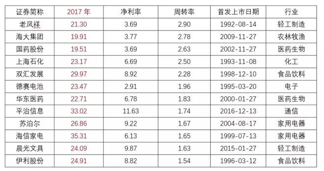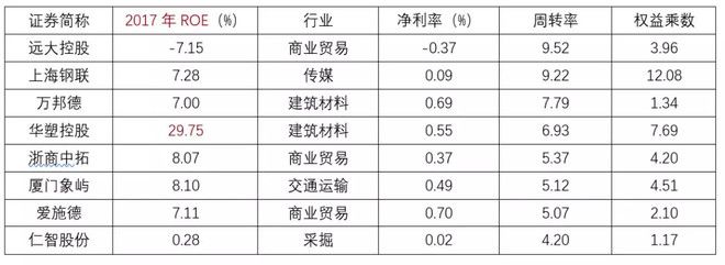 到这里,我们思考一个问题,什么类型公司的周转率最高?对的,是贸易型企业,那么贸易型企业的最大特点是什么?对的,是净利率低。这或许也是为什么高ROE企业里没有一家是高周转率了。下表是A股周转率最高的8家公司,周转率都在4以上,但是净利率没有1家超过1%,也只有与华塑控股的ROE超过15%了。但是华塑控股没有入选初善君分析的这149家原因是2016年他是巨额亏损,未满足连续三年一期的稳定高ROE指标。