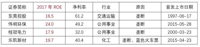 第一种无疑是垄断。垄断可以带来高净利率,这是毫无疑问的,而公用事业公司具有极强的垄断性质,也是巴菲特老爷子的爱股。在选出来的32家公司里,东莞控股是高速公路收费、伟明环保是垃圾焚烧发电,桂冠电力是发电,乐凯新材是蓝色火车票供应商,基本属于垄断地位,因此四家公司的净利率分别为61.2%、49.2%、32.0%和40.4%,其对应的ROE也分别为16.5%、24%、17.9%和19.7%。