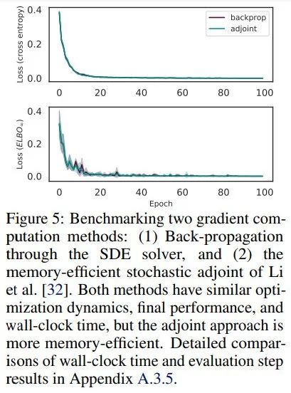 为了对比求解器与 adjoint 的反向传播,研究者比较了固定和自适应步长的 SDE 求解器,并比较了 Li 等人提出的随机 adjoint 之间的比较, 图 5 显示了这两种方法具有相似的收敛性: