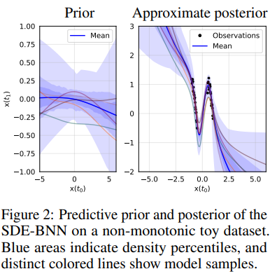 该研究首先验证了 SDE-BNN 在 1D 回归问题上的表现。以弥散过程的样本为条件,来自 1D SDE-BNN 的每个样本都是从输入到输出的双向映射。这意味着从 1D SDE-BNN 采样的每个函数都是单调的。为了能够对非单调函数进行采样,该研究使用初始化为零的 2 个额外维度来增加状态。图 2 显示了模型在合成的非单调 1D 数据集上学习了相当灵活的近似后验。