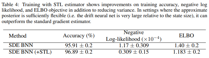 图 4 显示了多个梯度估计器的方差,该研究将 STL 与「完全蒙特卡罗(Full Monte Carlo)」估计进行了比较。图 4 显示,当匹配指数布朗运动时,STL 获得的方差比其他方案低。下表 4 显示了训练性能的改进。