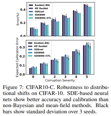 下图 7 显示了损坏测试集上相对于未损坏数据的误差,表明随着扰动严重性级别的增加以及表 1 中总结的总体误差度量,mCE 稳步增加。在 CIFAR10 和 CIFAR10-C 上,SDE-BNN 和 SDE -BNN + STL 模型实现了比基线更低的整体测试误差和更好的校准。