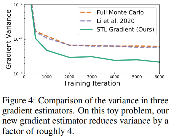 等式 (12) 中的第二项是鞅(martingale),期望值为零。在之前的工作中,研究者仅对第一项进行了蒙特卡罗估计,但该研究发现这种方法不一定会减少梯度的方差,如下图 4 所示。