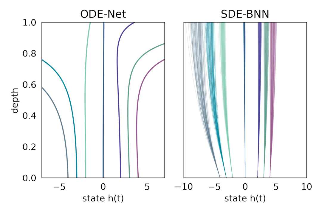 在这种方法中,输出层的状态由黑盒自适应随机微分方程(SDE 求解器计算,并训练模型以最大化变分下界。下图将这种神经 SDE 参数化与标准神经 ODE 方法进行了对比。这种方法保持了训练贝叶斯神经 ODE 的自适应计算和恒定内存成本。