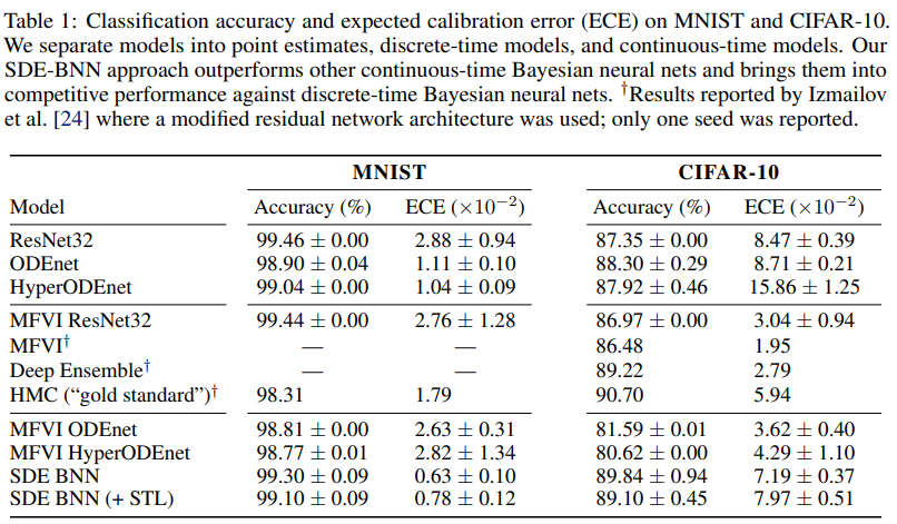表 1 用预期校准误差量化了模型的校准。SDE-BNN 似乎比神经 ODE 和平均场 ResNet 基线能更好地校准。
