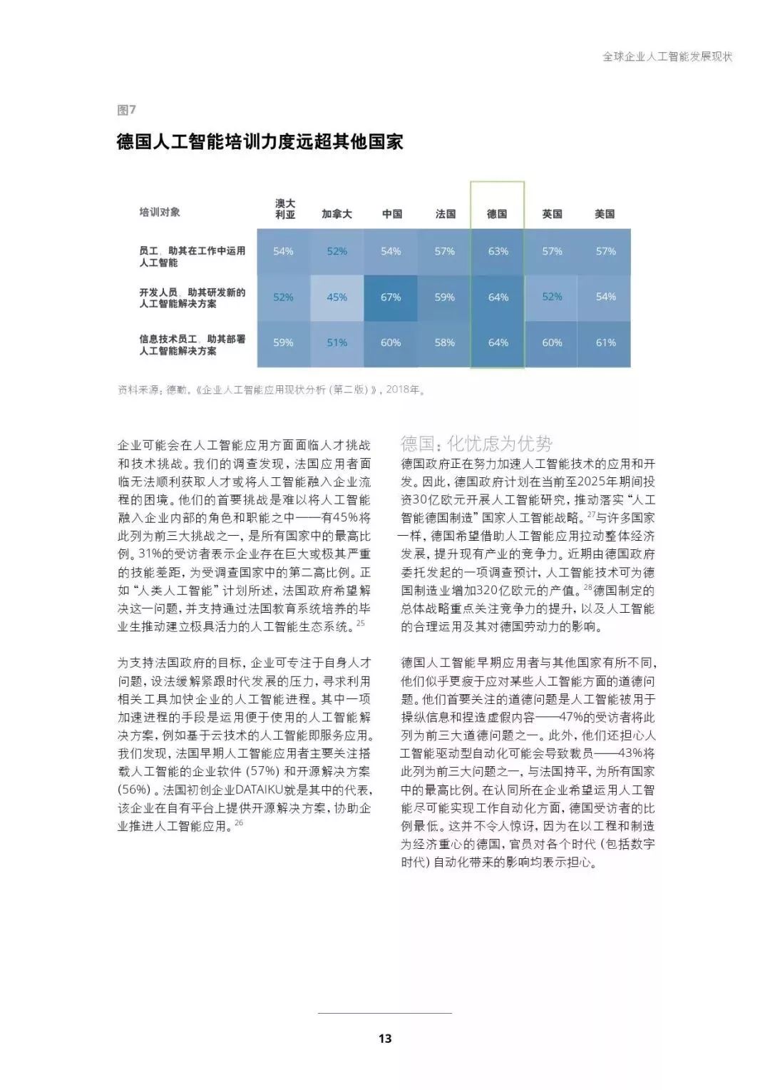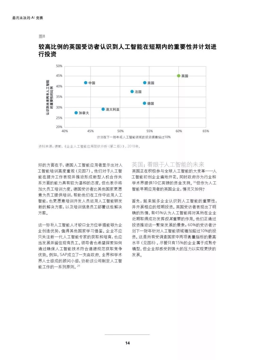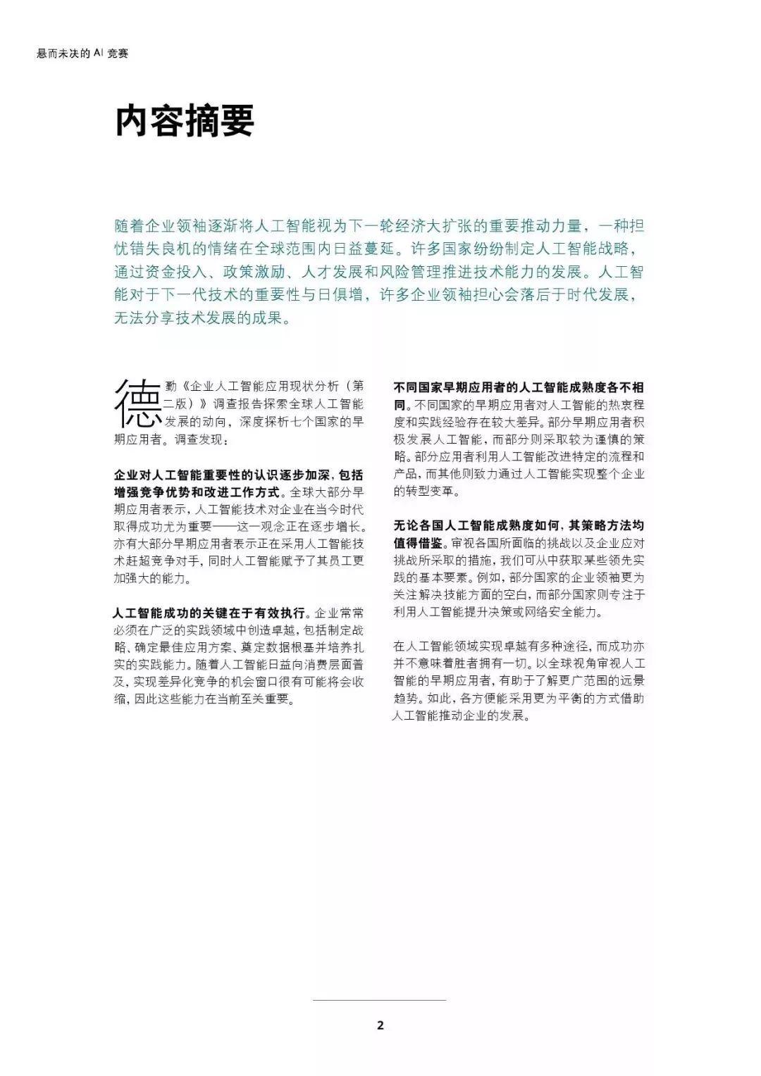 《悬而未决的AI竞赛——全球企业人工智能发展现状》由德勤洞察发布,德勤中国科技、传媒和电信行业编译。为了解全球范围内的企业在应用人工智能技术方面的情况以及所取得的成效,德勤于2018年第三季度针对早期人工智能应用企业的1900名信息技术及业务线高管开展了调查,范围涵盖七个国家:澳大利亚、加拿大、中国、德国、法国、英国以及美国。该调查重点关注了全球人工智能发展动态,以全球视角解读早期应用者,希望帮助所有企业制定更明智、更均衡的策略实现人工智能领域的独特优势。我们在深度探索七个国家的早期应用者后,发现: