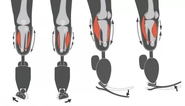 这种耦合运动能让肌腱中的神经生物传感器将电信号传输至中枢神经系统,传达肌肉长度、速度和力量信息,然后这些信息被大脑翻译为假肢的本体感受。