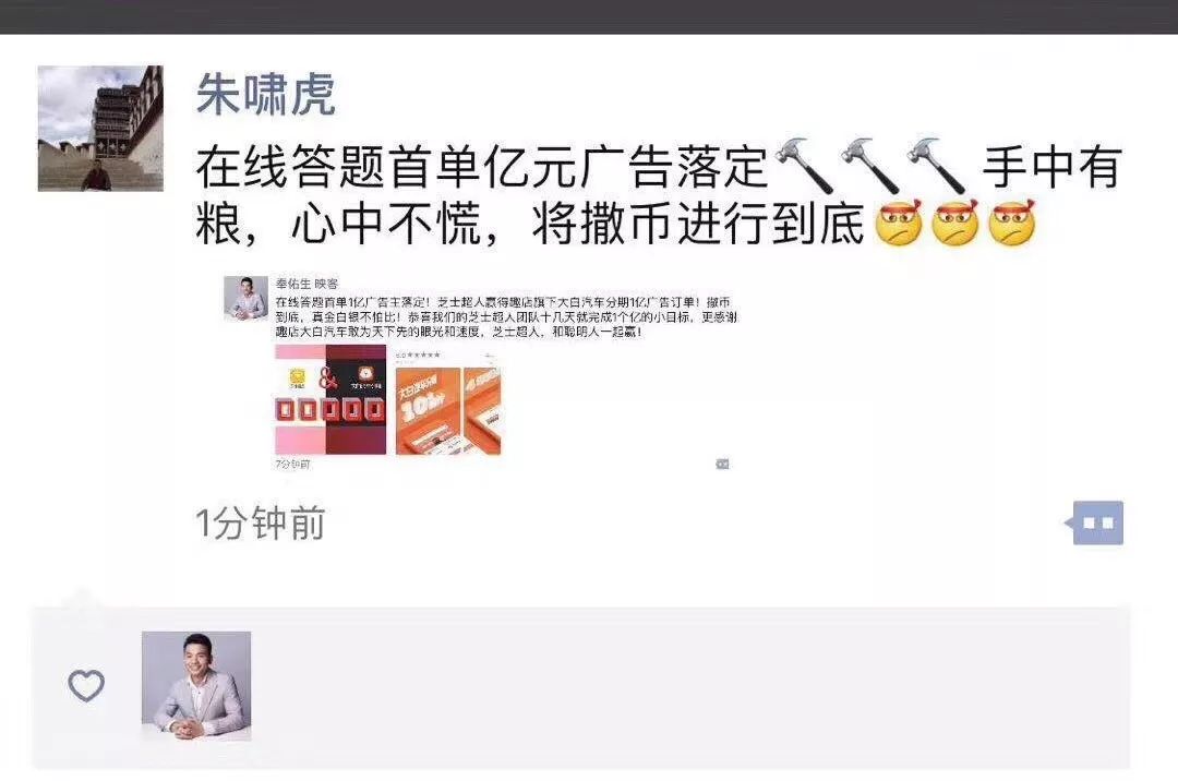 与此同时,映客创始人兼CEO奉佑生在朋友圈宣布,“芝士超人”获得趣店旗下的大白汽车分期1亿元赞助。“撒币到底,真金白银不怕比!”言语之间是毫不隐藏的激动。