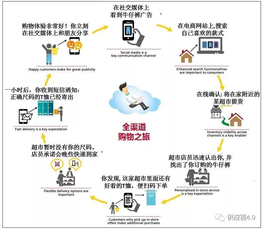 图2生动阐释了全渠道消费体验的“闭环”:在选购一条牛仔服的过程中,社交媒体和电商网站帮助他做了购买决策。在超市提货时,以顾客为中心的服务让他倍感满意,并且还当场产生了新的购物需求:买一件T恤。店内扫码下单的功能让这个需求即刻被满足;即便有衣服“断码”的问题,也被跨仓库在线调货功能轻松化解。T恤快递到家的全过程追踪都可以推送到顾客手机,而这种愉快的体验又触发了新一轮的社交媒体互动。