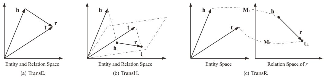 基于距离的翻译模型(distance-based translational models)。这类模型使用基于距离的评分函数评估三元组的概率,将尾节点视为头结点和关系翻译得到的结果。这类方法的代表有TransE、TransH、TransR等;