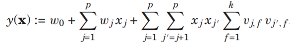 以LibFM[1]为代表的通用的基于特征的推荐方法(generic feature-based methods)。这类方法统一地把用户和物品的属性作为推荐算法的输入。例如,LibFM将某个用户和某个物品的所有属性记为x,然后令该用户和物品之间的交互强度y(x)依赖于属性中所有的一次项和二次项: