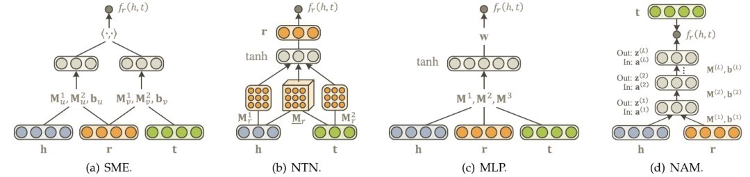 基于语义的匹配模型(semantic-based matching models)。这类模型使用基于相似度的评分函数评估三元组的概率,将实体和关系映射到隐语义空间中进行相似度度量。这类方法的代表有SME、NTN、MLP、NAM等。