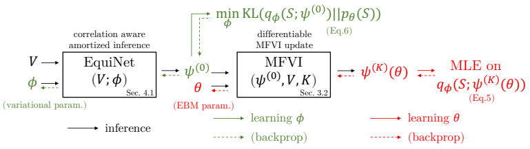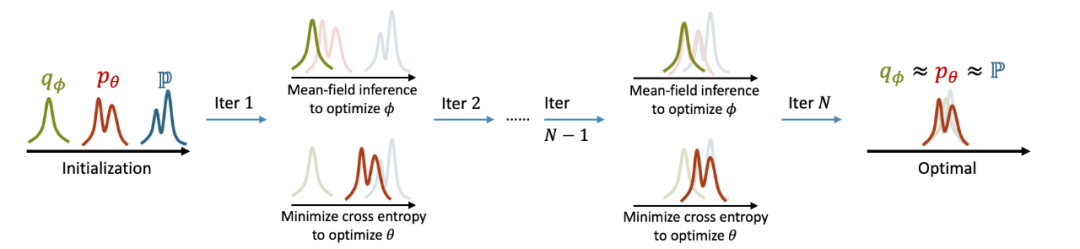 模型通过反复迭代步骤 1 和 2 来更新参数, 从而达到合作式训练变分网络 EquiNet 和能量网络的目的。这种合作学习方式的效果可以通过图 3 形象示意:在每轮迭代中,我们通过均摊变分推断来更新变分分布的参数,使其不断逼近模型