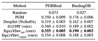 3. 在分子筛选中,我们使用 PDBBind 和 BindingDB 两个经典数据。该任务是从给定的分子库中,筛选出符合一定属性的分子。下表是 EquiVSet 和各个方法的对比结果。
