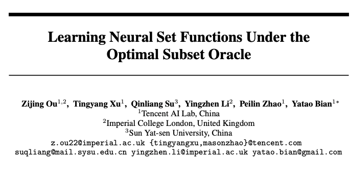 腾讯 AI Lab、帝国理工与中山大学合作发表论文《Learning Neural Set Functions Under the Optimal Subset Oracle》,提出基于最优子集的集合函数学习方法。