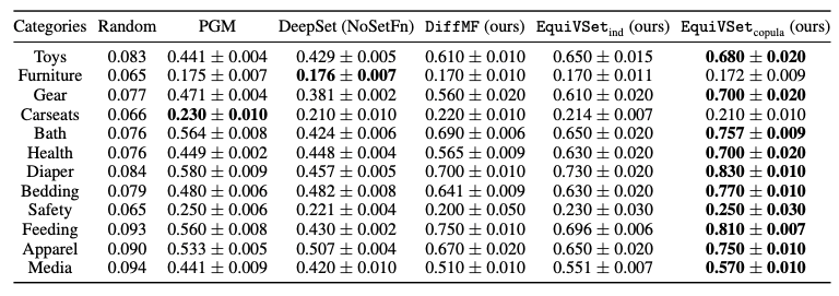 1. 在商品推荐任务中,我们使用 amazon baby register dataset,该数据集包含了真实的用户购买记录。在该任务上,EquiVSet 在大部分场景中都取得最佳性能。具体地,相比于先前的 SOTA 算法 PGM,EuiVSet 的性能平均提升 33%。相比于传统的黑盒端到端子集预测方法 DeepSet(NoSetFn)(该方法相当于仅建模了变分网络 EquiNet),EquiVSet 的性能平均提升 39%,说明了显式建模集合函数的重要性。