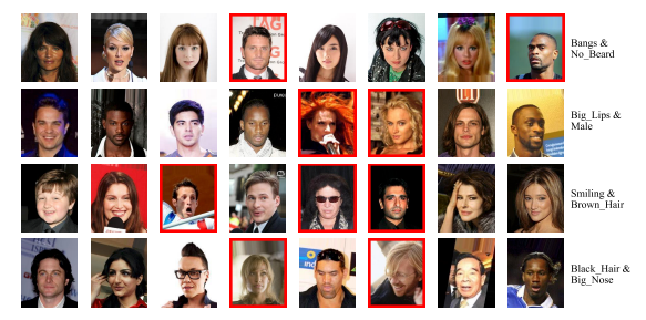 图 3 celebA 数据集。每一行是一个数据样本。在每个样本中,正常图片拥有两个共同属性(最右列),异常图片(红色方框)没有该属性。