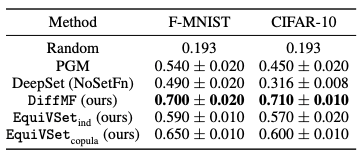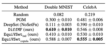 以下表格提供不同方法在该任务上的性能对比,可以看出 EquiVSet 显著优于其他方法, 并比 PGM 和 DeepSet(NoSetFn) 的性能分别平均提高 37% 和 80%。