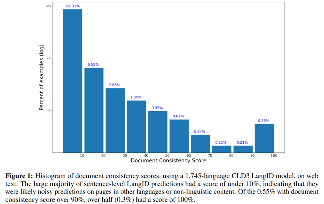 如下为使用 1745-language 的 CLD3 LangID 模型在 web 文本上的文档一致性得分直方图。