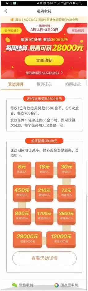 用户仅靠阅读赚取的奖励很少。更容易获得现金的方式是“收徒”。“收徒”最初的规则是用户每收一名徒弟奖励8元现金,这8元要分12次发放。徒弟每阅读一条新闻,都会间接给师傅“上贡”。为了拿到更多的奖励,“师傅”不仅需要不断邀请、发放验证码邀请更多徒弟,还必须不断“唤醒”,让徒弟保持阅读的活跃度,才能获得全部奖励。