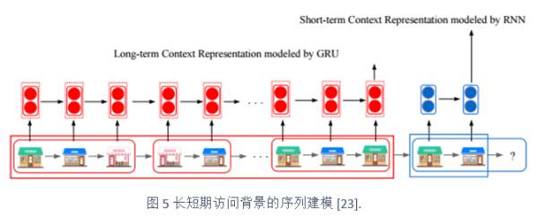 上述工作都是基于用户与物品的点对推荐模式,并没有充分考虑物品的时序关系。Hidasi等人[21]使用循环神经网络进行基于session的推荐,该工作是对于RNN的一个直接应用。Brébisson等人[22]使用神经网络模型进行解决2015年的ECML/PKDD 数据挑战题目“出租车下一地点预测”,取得了该比赛第一名。在[22]中,作者对于多种多层感知器模型以及循环神经网络模型进行对比,最后发现基于改进后的多层感知器模型取得了最好的效果,比结构化的循环神经网络的效果还要好。在[23]中,Yang等人同时结合RNN及其变种GRU模型来分别刻画用户运动轨迹的长短期行为模式,通过实验验证,在“next location”推荐任务中取得了不错的效果。如图5所示,给定一个用户生成的轨迹序列,在预测下一个地点时,直接临近的短期访问背景和较远的长期访问背景都同时被刻画。