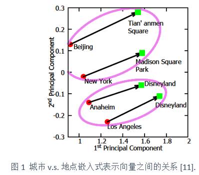 在[9]中,嵌入式表示被应用到了产品推荐中,给定一个当前待推荐的产品,其对应的生成背景(context)为用户和上一个交易的产品集合,利用这些背景信息对应的嵌入式表示向量可以形成一个背景向量,刻画了用户偏好和局部购买信息的依赖关系。然后基于该背景向量,生成当前待推荐的产品。经推导,这种模型与传统的矩阵分解模型具有很强的理论联系。在[10]中,Zhao等人使用doc2vec模型来同时学习用户和物品的序列特征表示,然后将其用在基于特征的推荐框架中,引入的嵌入式特征可以在一定程度上改进推荐效果。在[11]中,嵌入式表示模型被用来进行地点推荐,其基本框架就是刻画一个地理位置的条件生成概率,考虑了包括用户、轨迹、临近的地点、类别、时间、区域等因素。比较有趣的是,该研究中发现了类似文本中的“man-woman ≈ king-queen”等模式。图1中给出了一个“城市vs.地点”的例子,可以看到可以观察到