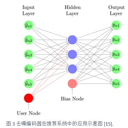 较早使用神经网络模型的一个代表性工作可以追溯到NIPS 2007。Salakhutdinov等人使用限制玻尔兹曼机进行评分预测 [12]。如图2所示,其所使用的模型较为简单,具有一个两层的类二部图结构,其中用户层为隐含层 (h),可见层为用户的评分信息 (V),通过非线性关联两层上的数据信息。其中隐含层为二元变量,而用户评分信息被刻画为多项式分布变量。建立用户隐含表示信息以及其评分信息的联合能量函数,然后进行相应的参数求解。该方法的一个主要问题是连接隐含层和评分层的权重参数规模过大(对于大数据集合),也就是权重矩阵W。因此作者进一步提出使用将W分解为两个低秩矩阵,减小参数规模。值得一提的是,该工作是Ruslan Salakhutdinov和Geoffrey Hinton合作完成,其中Salakhutdinov也是Probabilistic Matrix Factorization[13]的作者。不过实验效果表明[13]中所提出的方法并没有比基于矩阵分解的方法具有显著的改进,而且参数求解使用较为费时的近似算法。在[14]中,Zhang 等人提出使用Neural Autoregressive Distribution Estimator来改进上述问题,该方法不需要显式对于二元隐含变量进行推理,减少了模型复杂度,并且使用排序代价函数来进行参数最优化。实验表明所提出的方法能够取得非常好的效果。不同于[13,14],在[15]中,Wu等人使用去噪自动编码模型(Denoising Autoencoder)进行top-N物品推荐,其输入为加入噪声的对于物品的偏好(采纳为1,否则为0),输出为用户对于物品的原始评分,通过学习非线性映射关系来进行物品预测。如图3所示,用户可见的评分数据通过加上噪音后进入输入层,然后通过非线性映射形成隐含层,再由隐含层经映射后重构评分数据。注意,该模型中加入了用户偏好表示(User Node)和偏置表示(Bias Node)。