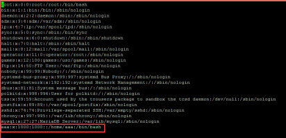 然后通过vi /etc/passwd来查看aaa这个用户是否被创建