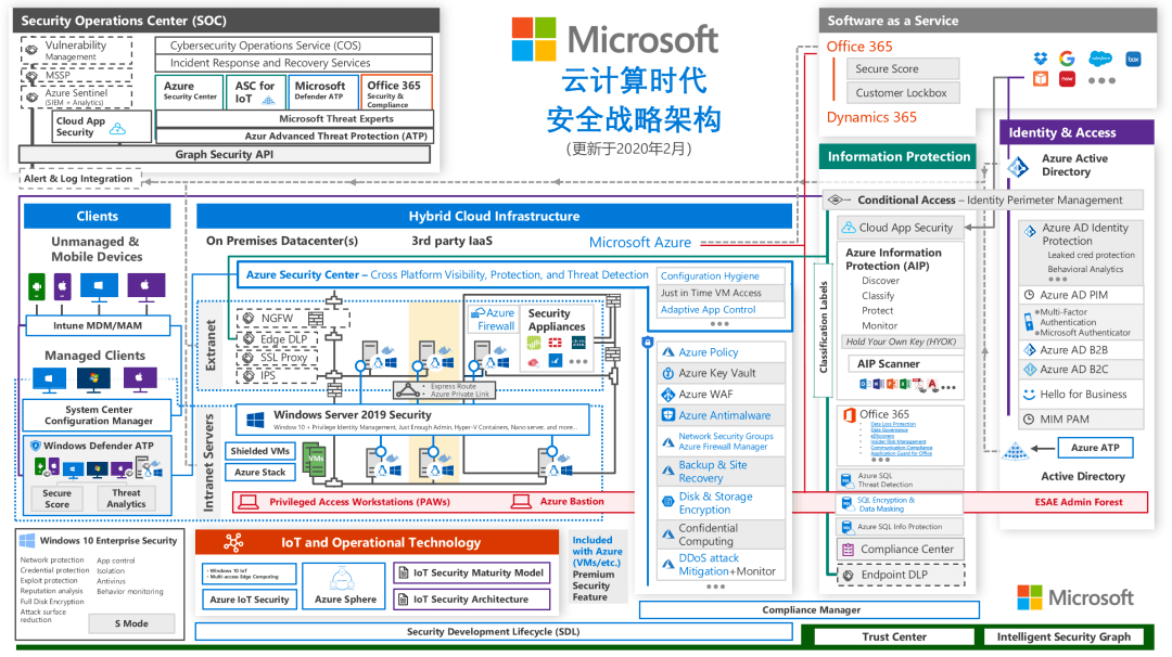 从战略上,微软将网络安全上升为核心战略方向之一;从研发投入上,微软每年在安全研发方面投入超过 10 亿美元;从技术架构上,微软具有完善的云计算安全战略架构,关注企业网络安全的各个方面,全方位捍卫企业安全: