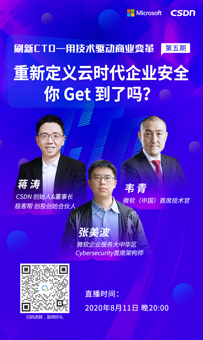 8 月 11 日,由 CSDN、微软联合重磅打造,致力于用「用技术驱动商业变革」的《刷新 CTO》第五期,盛邀 CSDN 创始人&董事长、极客帮创投创始合伙人蒋涛,微软(中国) 首席技术官韦青,微软企业服务大中华区 Cybersecurity 首席架构师张美波,共同探讨云时代下,企业如何搭建安全防护?