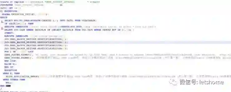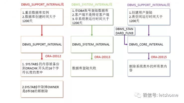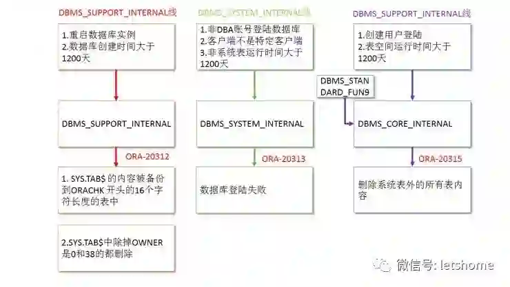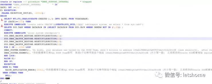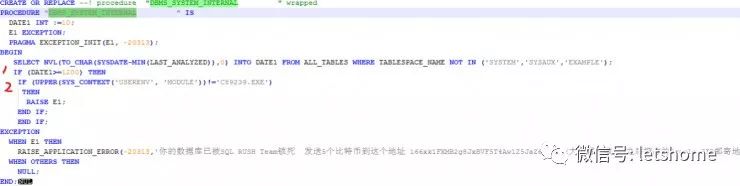 标记2的这个语句是整个存储过程的核心。勒索者首先对tab$表进行备份,把备份的表设置成一定特点的随机名称,方便收到赎金后从新帮用户找回数据。接着马上删除了tab$表中除了SYS用户和第38号用户的全部信息。并把勒索信息写入到日志文件alert中,向用户实施勒索。请注意这条线的报错信息应该是ORA- 20312.如果在日志中发现ORA- 20312信息,很有可能您的数据库已经中了红线的招式,建议查找是否存在表名类似ORACHK样式的表来进一步判断是否已被入侵。