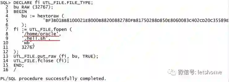 理想很美好,但现实却很骨感。在 windows 上如果数据库账号未经过降权限处理,此举或许可行,但对于 linux来说不可以,因为如此创建的文件并没有执行权限,根本无法执行或被调用。新建的文件不行,但如果是覆盖已有的文件,或许就能达到目的。其中,可以覆盖的文件有很多例如 oracle_home\bin 路径下的 dbstart。但是这种脚本的方式需要调用才能执行,很可能很久之后才能被动触发,如此守株待兔哪有主动出击来得畅快呢。
